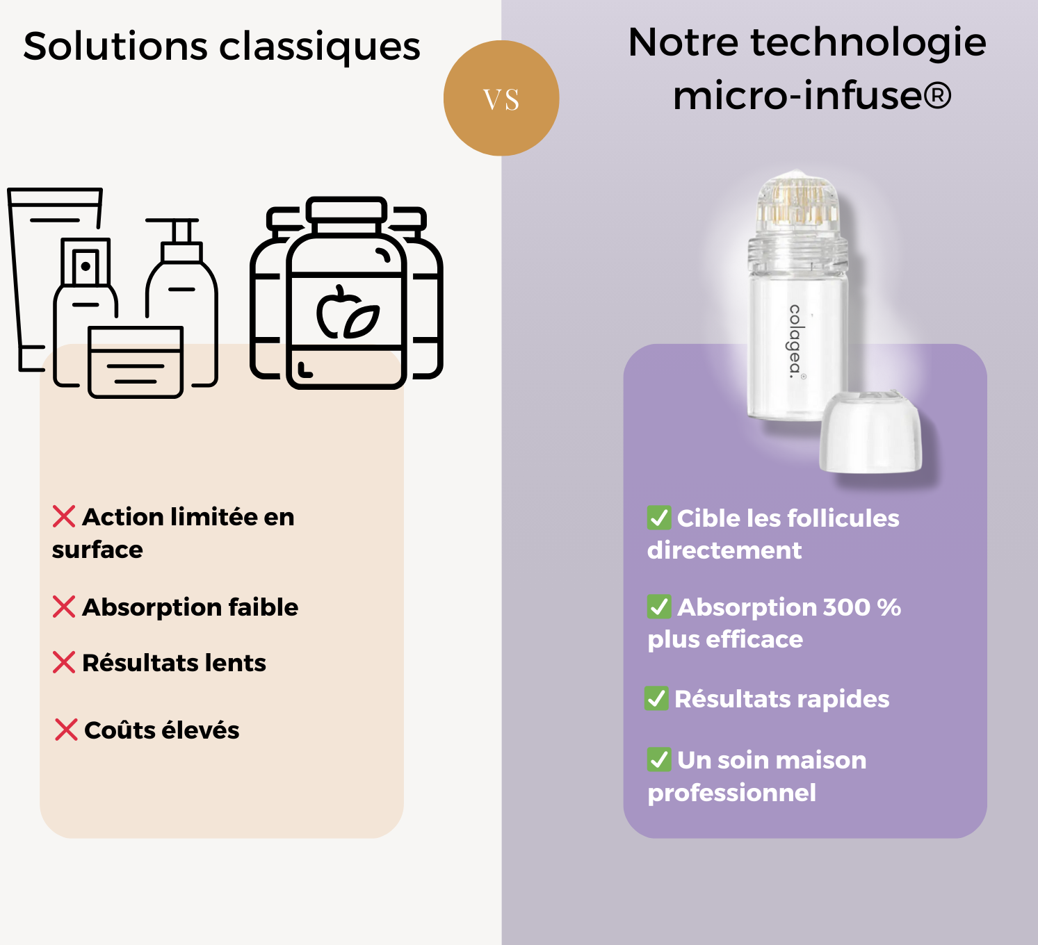 Colagea® est issue d’une collaboration entre un ingénieur biomédical et une spécialiste en dermatologie.Ensemble, ils ont conçu une solution alliant précision technologique et efficacité clinique : Micro-Infuse®, un système breveté de micro-infusion qui diffuse les actifs au cœur du follicule capillaire.Une approche scientifique. Des résultats visibles.
